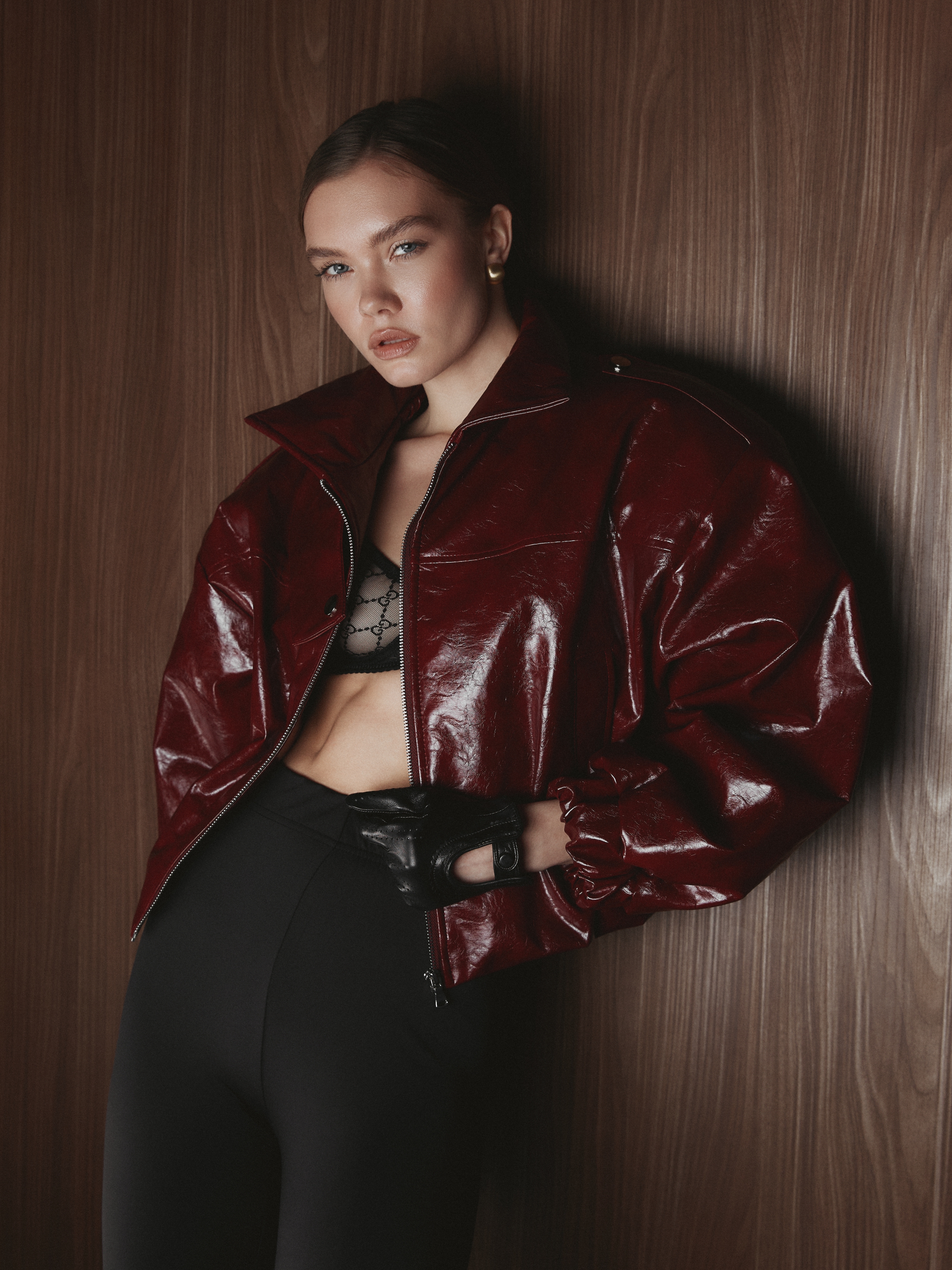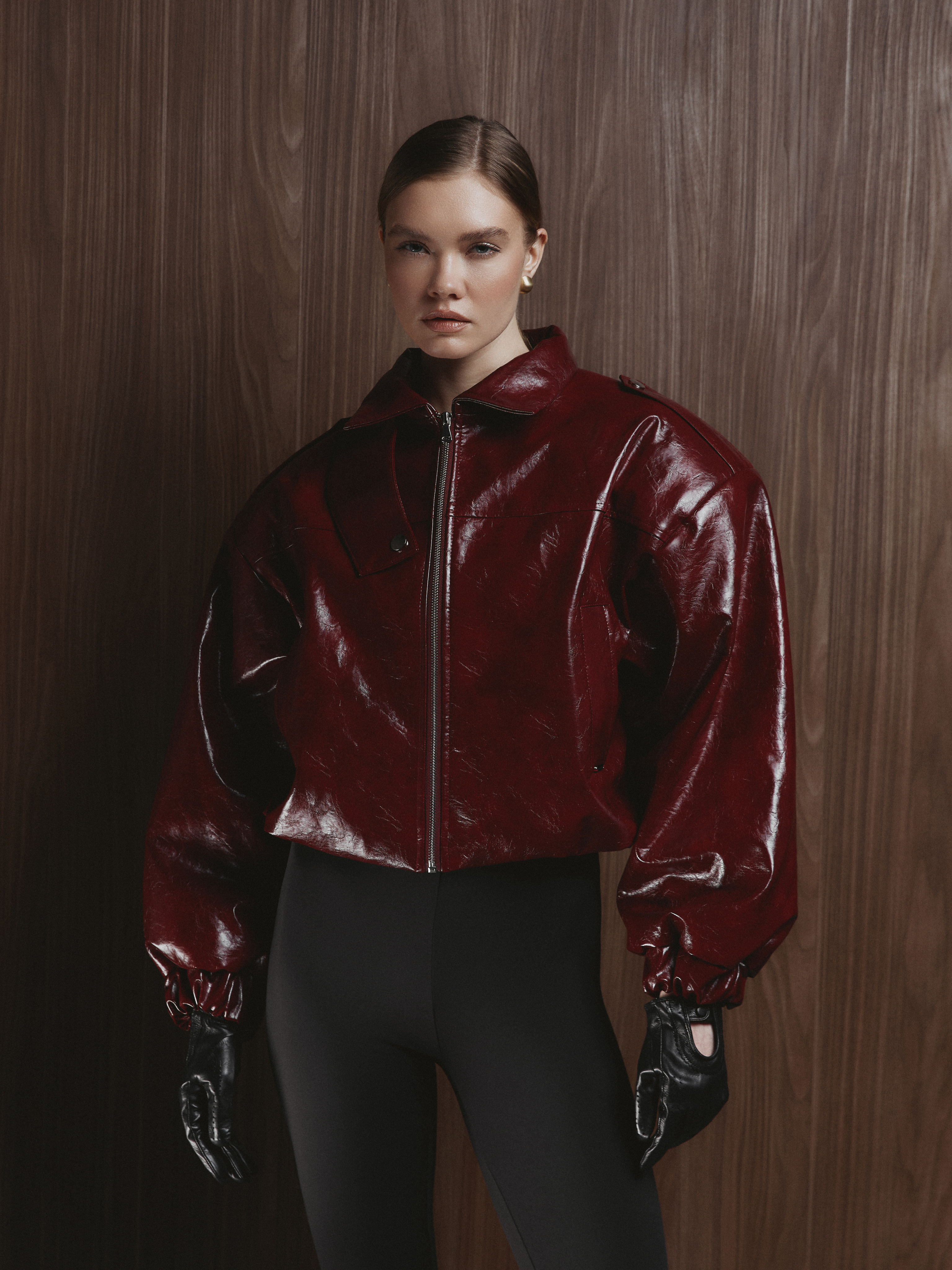 Чёткая линия плеч формирует выразительный силуэт, а укороченная длина подчёркивает пропорции и создаёт современную графику образа.