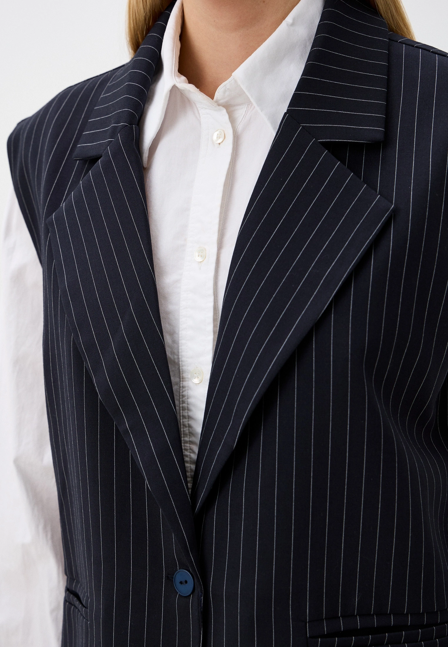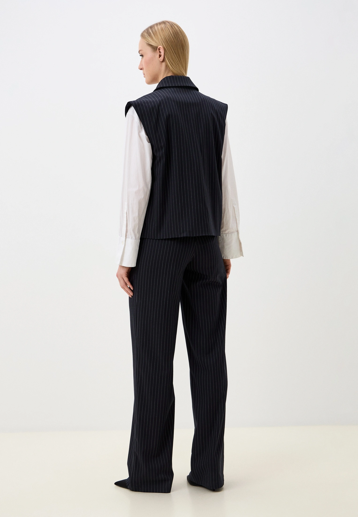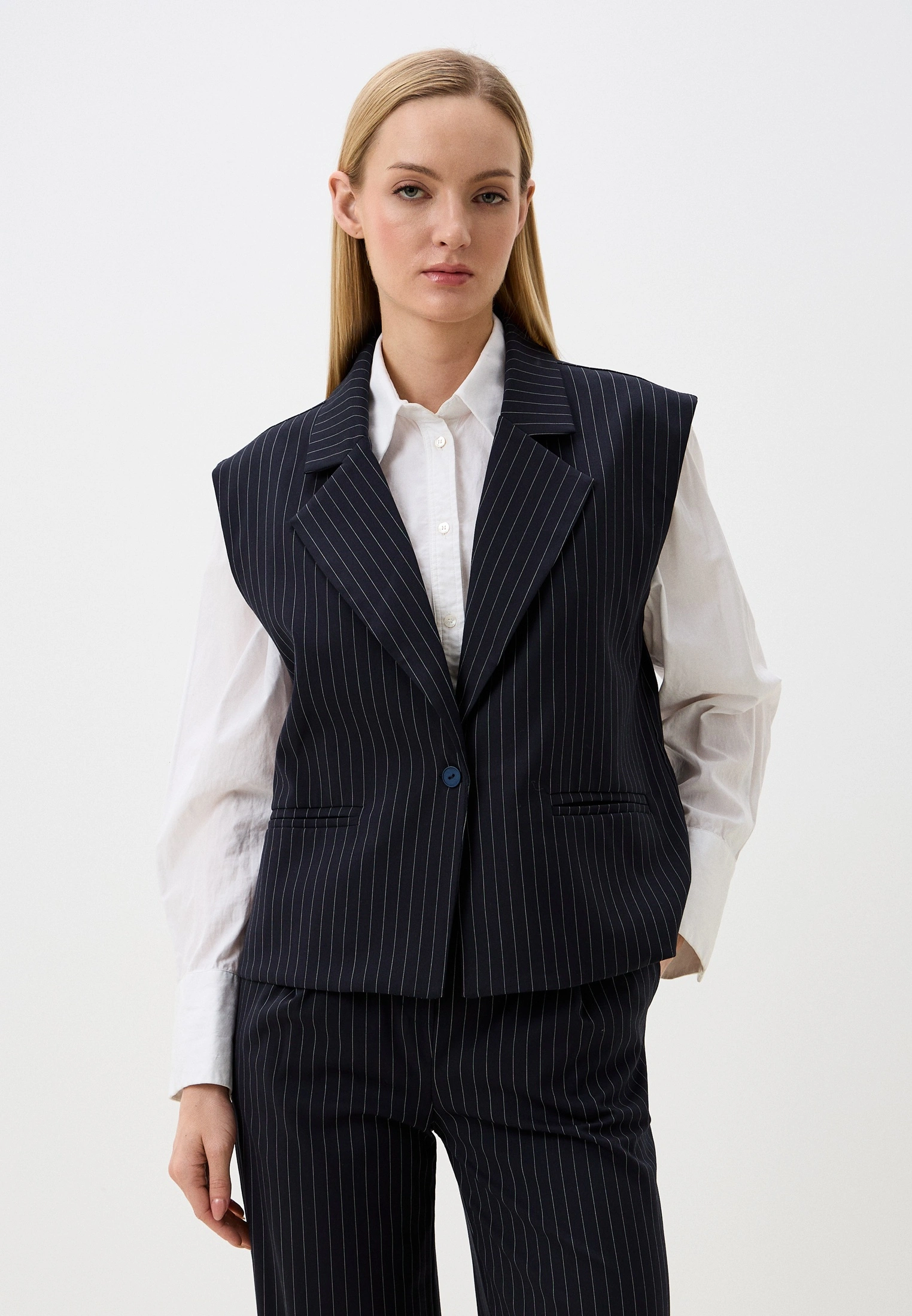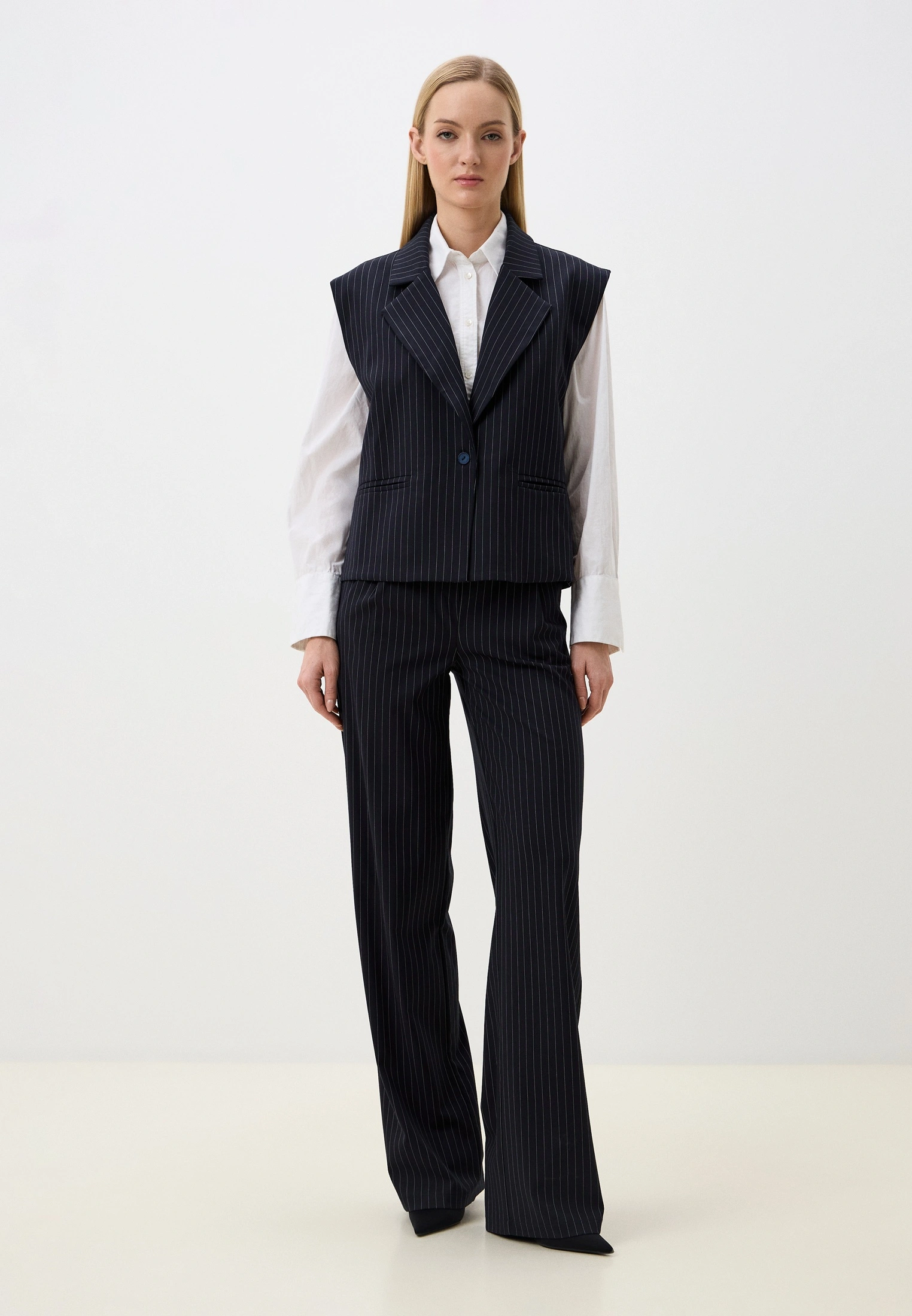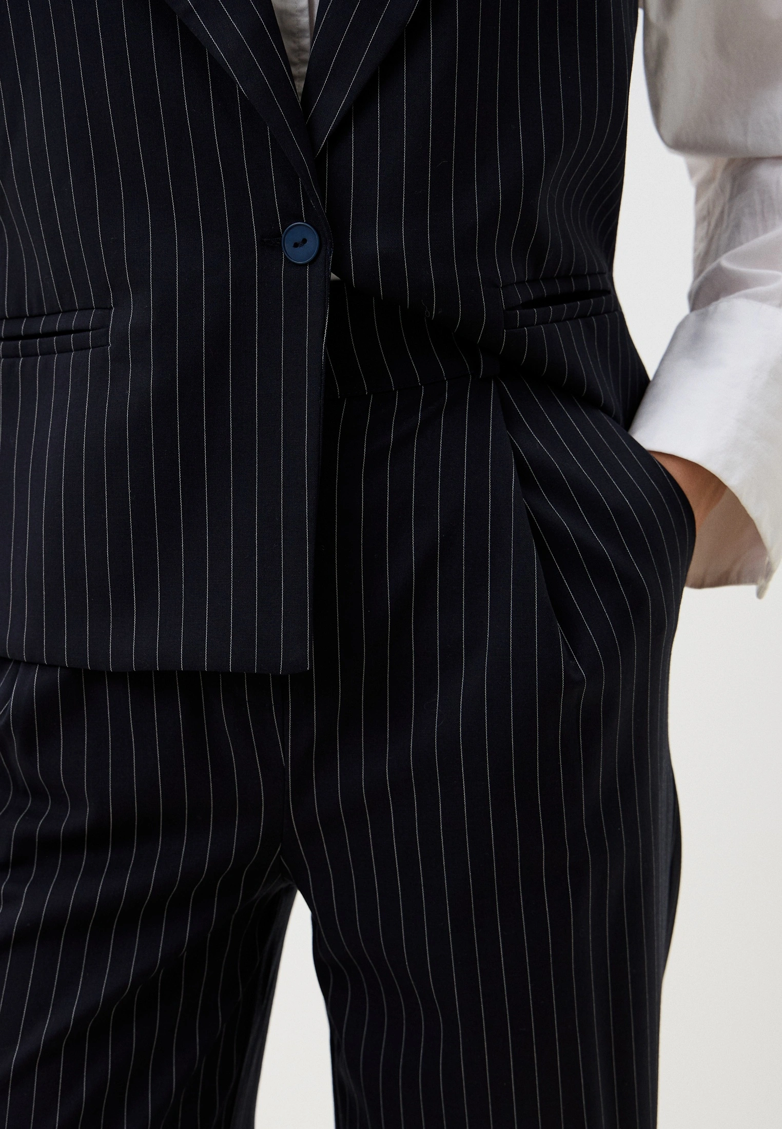 Жилет — прямого кроя, застёгивается на одну пуговицу, подчёркивая сдержанную строгость и архитектурность образа.