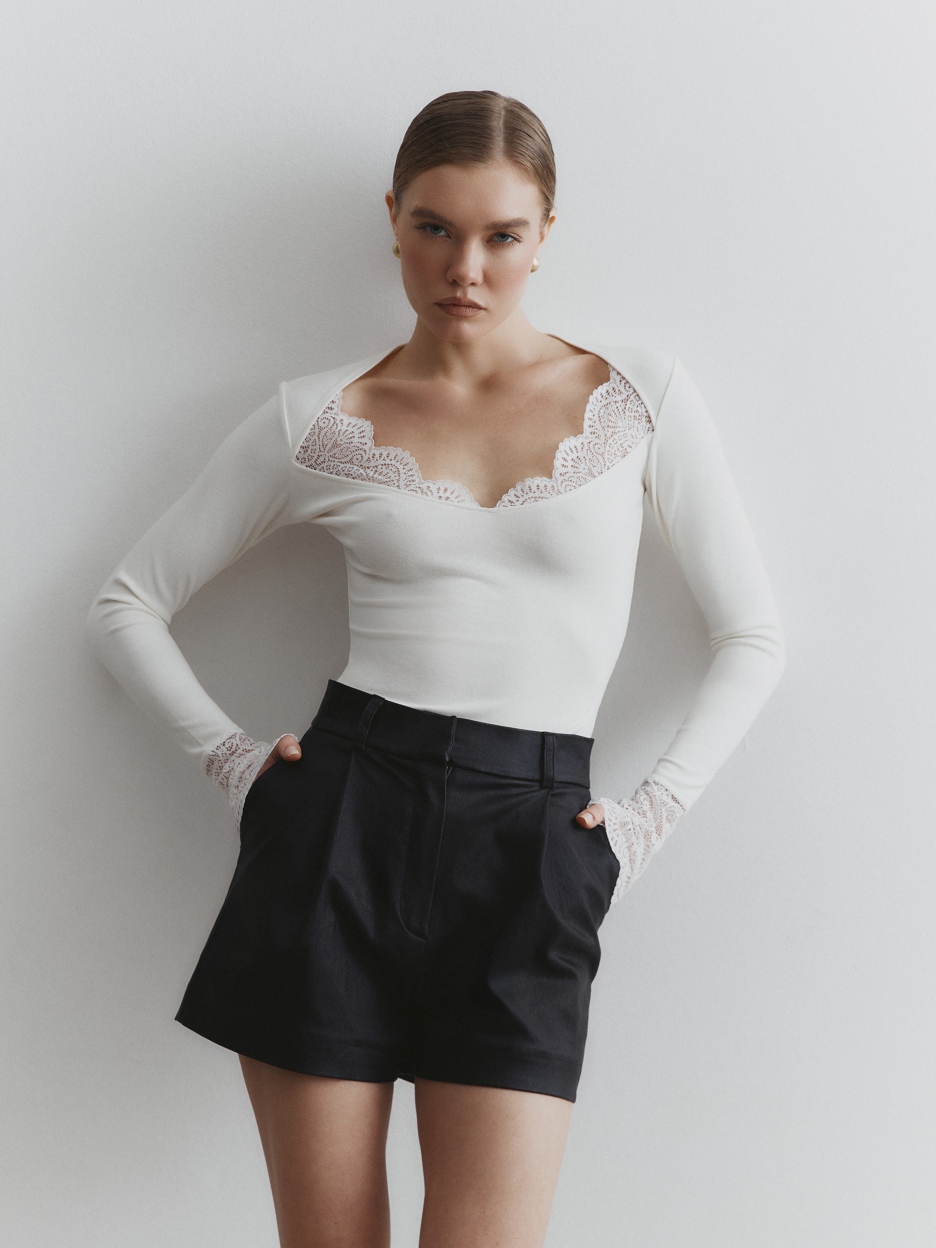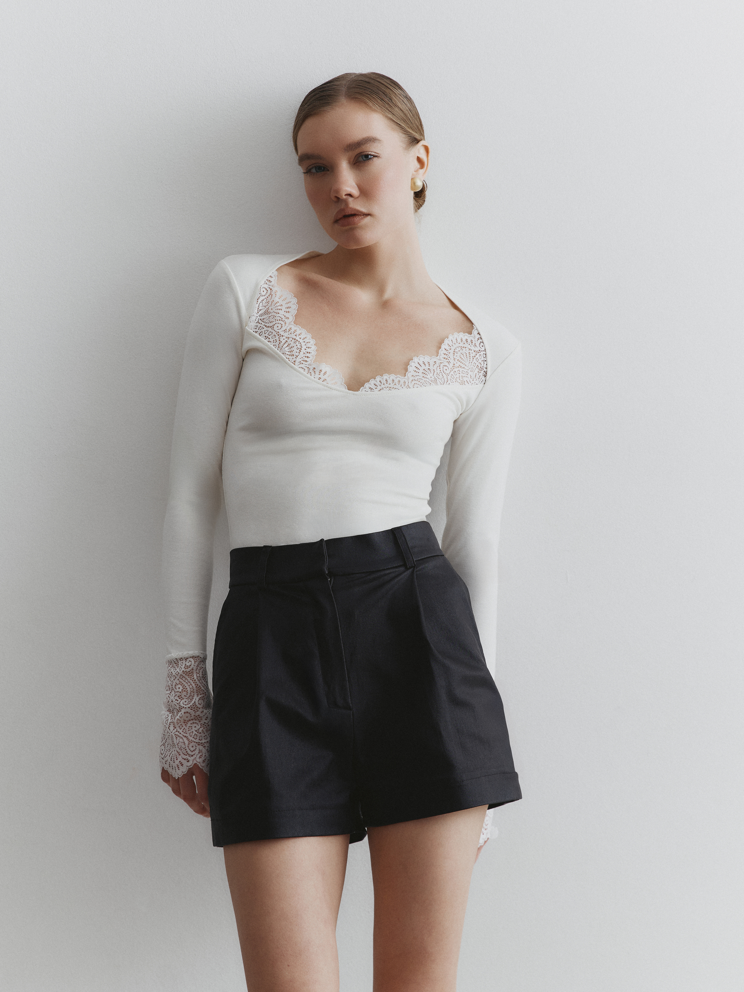 Глубокий вырез мягко подчёркивает линию шеи и ключиц, создавая акцент. Кружево деликатно обрамляет зону декольте, не перегружая силуэт.