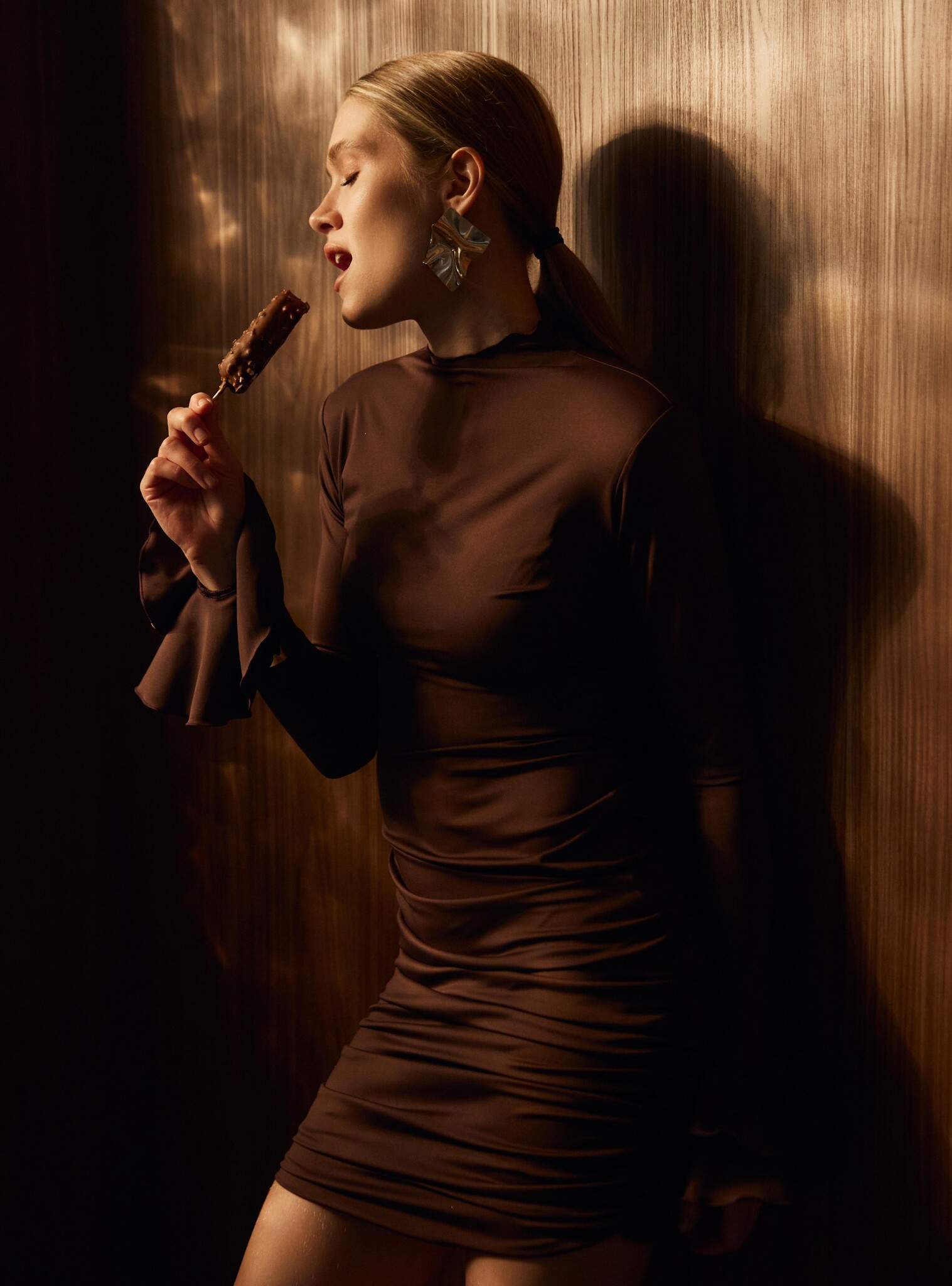 Плотная, но пластичная ткань с сатиновым отблеском мягко отражает свет, подчёркивая форму тела в движении.